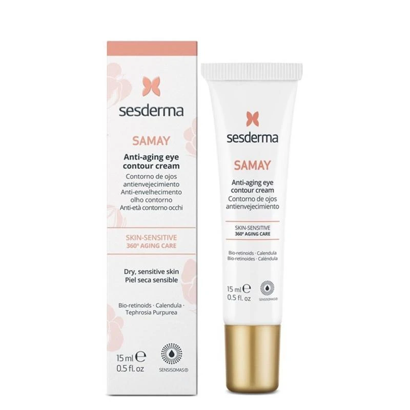 Sesderma samay anti-aging eye contour cream is an anti-wrinkle treatment for sensitive skin. As such, it is delicately formulated to combat periocular wrinkles, dark circles, and puffiness in sensitive skin.